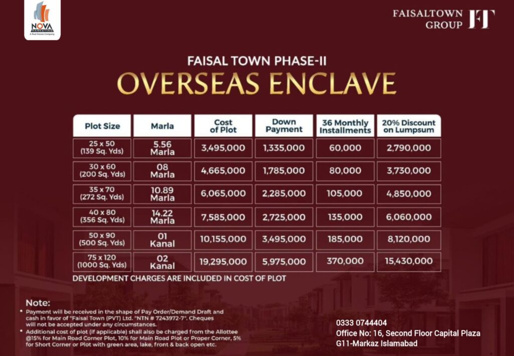 Faisal Town Phase 2, a prestigious name in Islamabad’s real estate landscape, has launched a brand new and investor-friendly payment plan for its Overseas Block in 2026. This newly introduced plan is designed specifically for overseas Pakistanis who desire a premium living experience or a high-return property investment in the heart of Pakistan’s capital region. Backed by a legacy of successful development and timely delivery, Faisal Town Phase 2 offers you a secure, luxurious, and well-connected lifestyle – and now, with flexible payment options, it’s even more accessible.